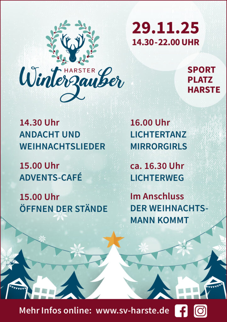 Seid Ihr bereit für festliche Stimmung, duftende Leckereien, heiße Getränke und kalte Nasen? Dann schaut vorbei und laßt uns am 29. November gemeinsam die Adventszeit einläuten und einen gemütlichen Wintertag erleben 🎄 Wir freuen uns auf Euch, also rein in die Wollsocken und raus auf den Sportplatz! 🎅🏻